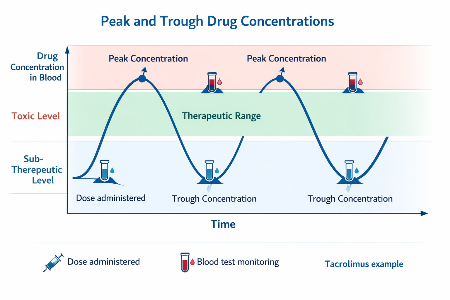 During drug therapy, the concentration of medication in the blood fluctuates over time. The peak concentration represents the highest level of drug in the bloodstream after administration, while the trough concentration represents the lowest level before the next dose. Monitoring both values helps clinicians ensure that the drug remains within the therapeutic range.
